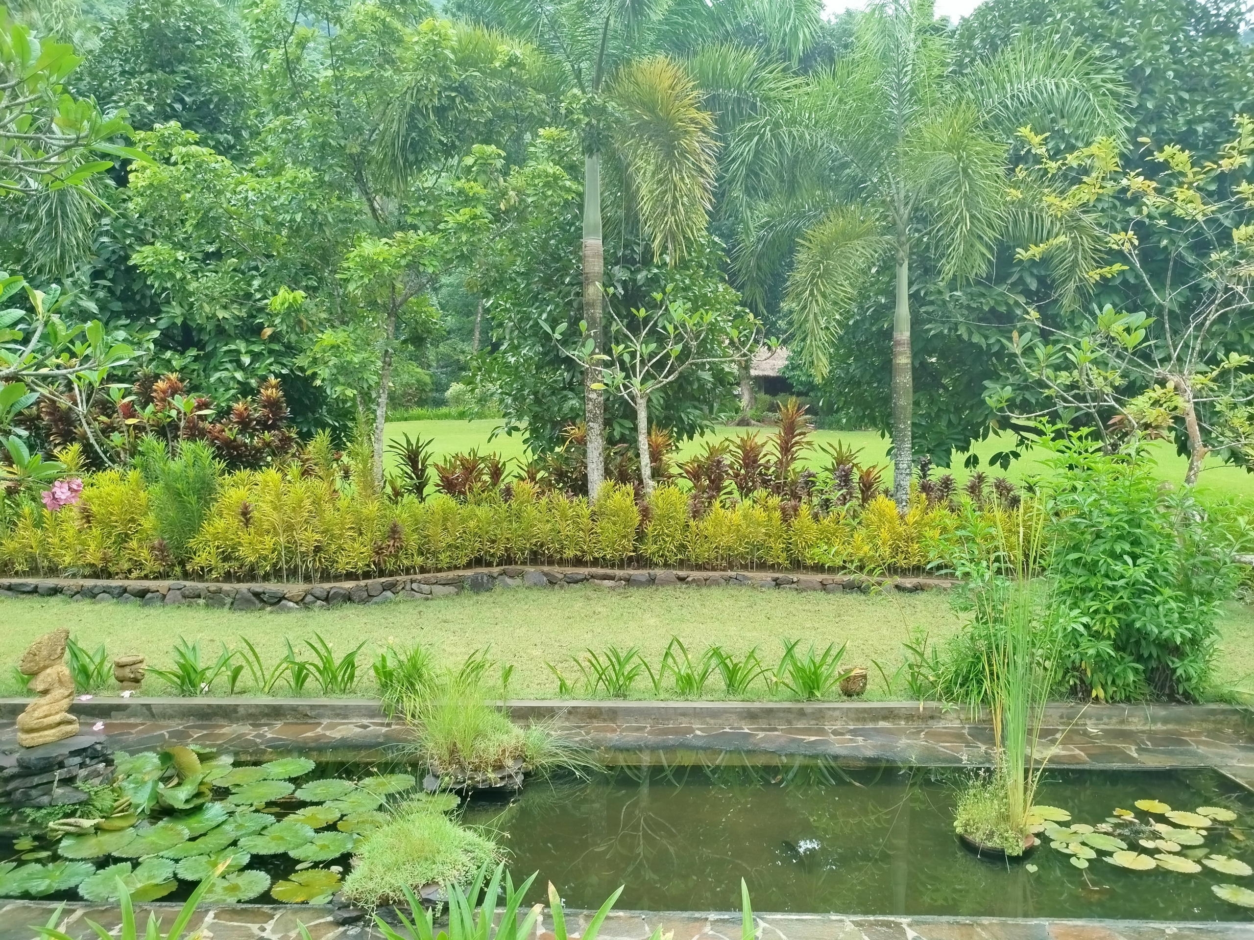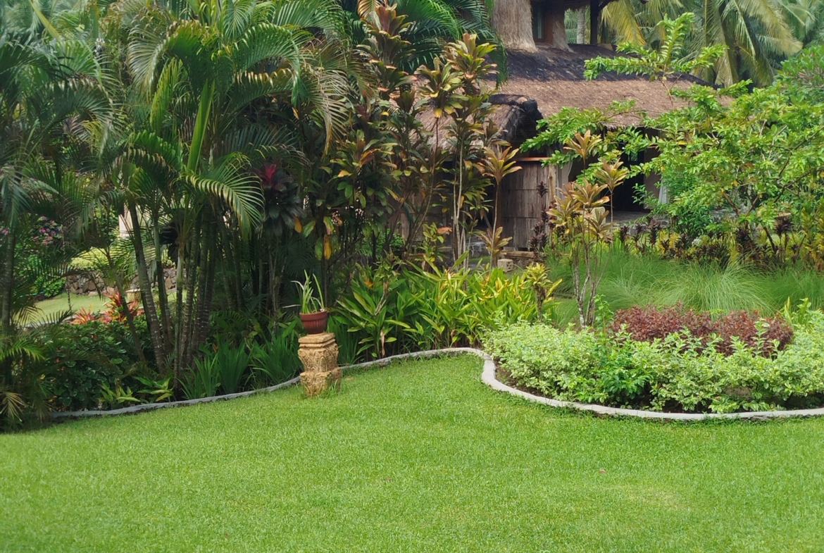 Landscaped areas with coconut palms, lawns, and a jungle backdrop
